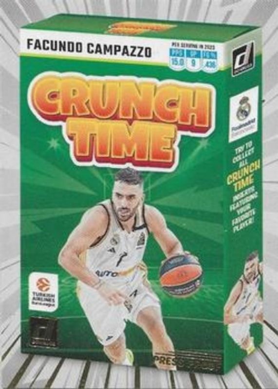 The Facundo Campazzo 2023 Donruss EuroLeague #17 Crunch Time - Press Proof card is 1 of 24 Facundo Campazzo's card variations in the 2023 Donruss EuroLeague set being tracked by Sports Card Investor, including Base, Optic, Optic - Holo, Press Proof Silver, and Yellow Flood.