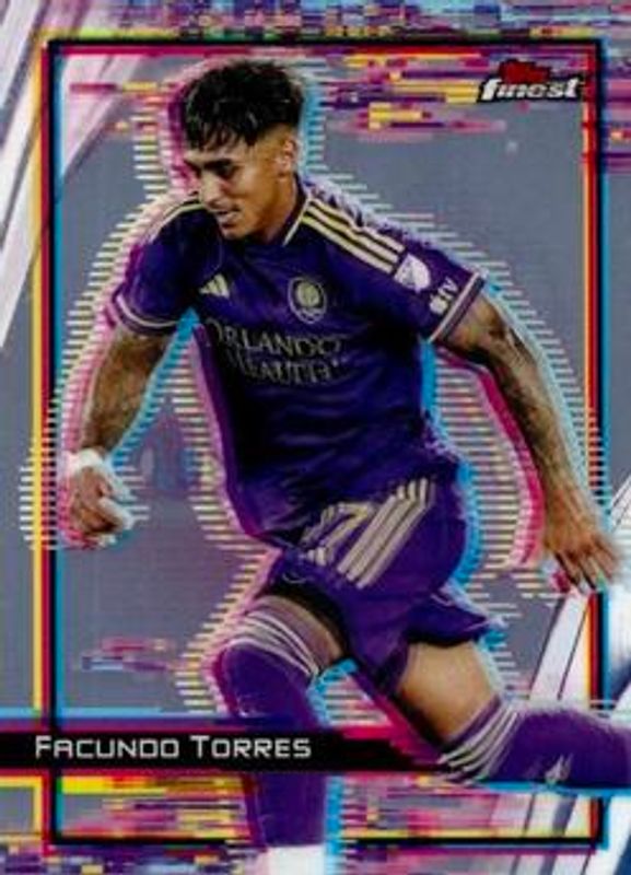 The Facundo Torres 2023 Topps Finest MLS #H-17 Set Hologlow Variation card is 1 of 41 Facundo Torres' card variations in the 2023 Topps Finest MLS set being tracked by Sports Card Investor, including Base, Refractor, Purple Refractor /250, Speckle Refractor /175, and Blue Refractor /150.