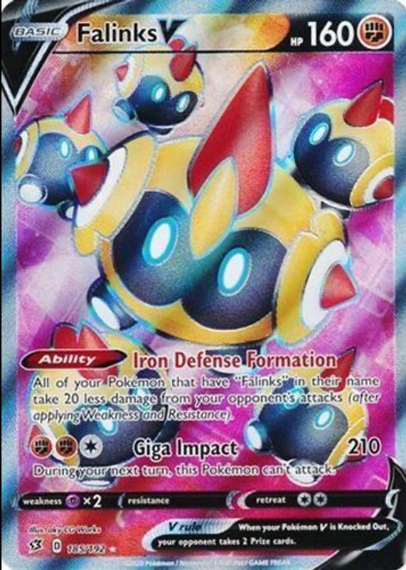 The Falinks V 2020 Sword & Shield: Rebel Clash #185/192 Holo (Full Art) card in Raw TCG (Near Mint) condition has moved down -$1.52 (-30.3%) in the last 30 days and was last sold for $3.50 .