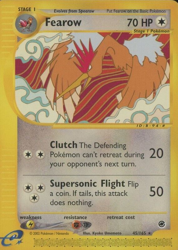 The Fearow 2002 Expedition #045/165 Base card in Raw TCG (Near Mint) condition has moved up $1.90 (+19.2%) in the last 30 days and was last sold for $11.80 .