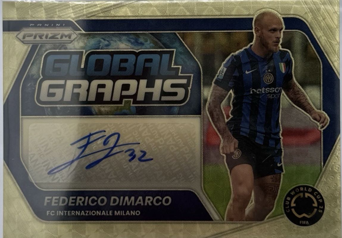 The Federico Dimarco 2025 Prizm Club World Cup #GG-FD Global Graphs - Gold Vinyl /1 card is 1 of 59 Federico Dimarco's card variations in the 2025 Prizm Club World Cup set being tracked by Sports Card Investor, including Base, Green Ice, Hyper, Ice, and Pandora.