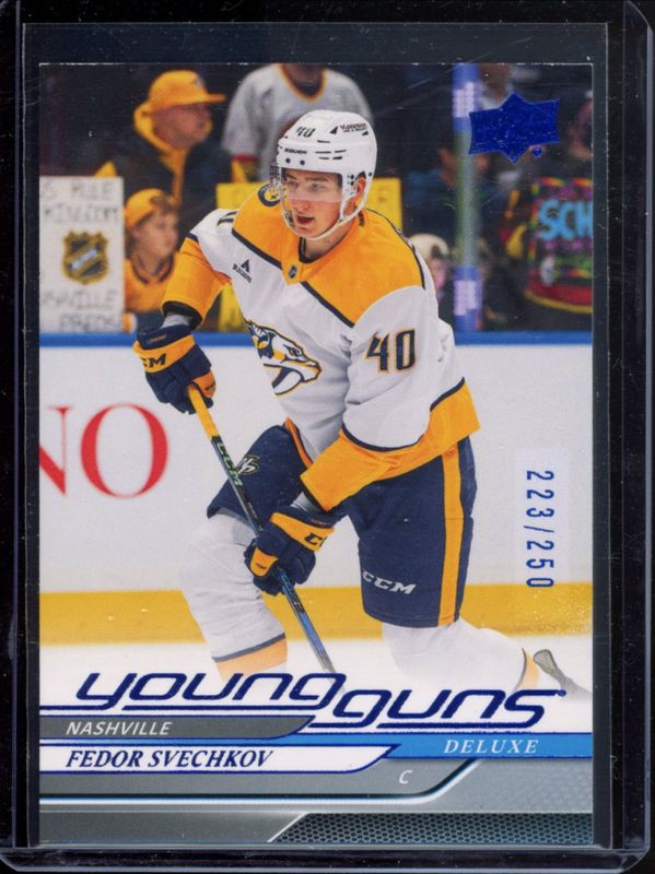 The Fedor Svechkov 2024 Upper Deck Extended Series #724 Deluxe /250 Rookie card is 1 of 61 Fedor Svechkov's card variations in the 2024 Upper Deck Extended Series set being tracked by Sports Card Investor, including #746 Base, #724 Base, #724 Young Guns Base, #724 Clear Cut, and #746 Clear Cut.