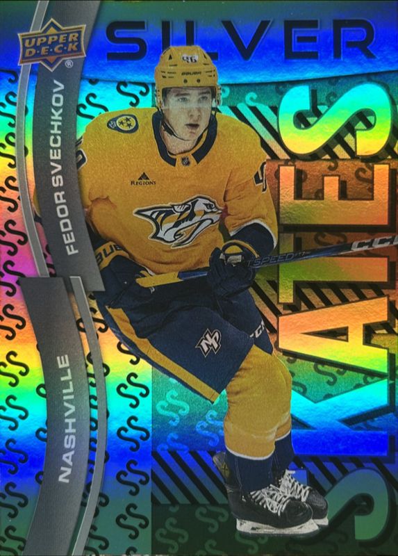 The Fedor Svechkov 2024 Upper Deck Extended Series #SS-34 Silver Skates Rookie card is 1 of 61 Fedor Svechkov's card variations in the 2024 Upper Deck Extended Series set being tracked by Sports Card Investor, including #746 Base, #724 Base, #724 Young Guns Base, #724 Clear Cut, and #746 Clear Cut.