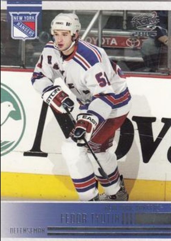 The Fedor Tyutin 2004 Pacific #180 Base card is 1 of 3 Fedor Tyutin's card variations in the 2004 Pacific set being tracked by Sports Card Investor, including Red, and Blue /250.