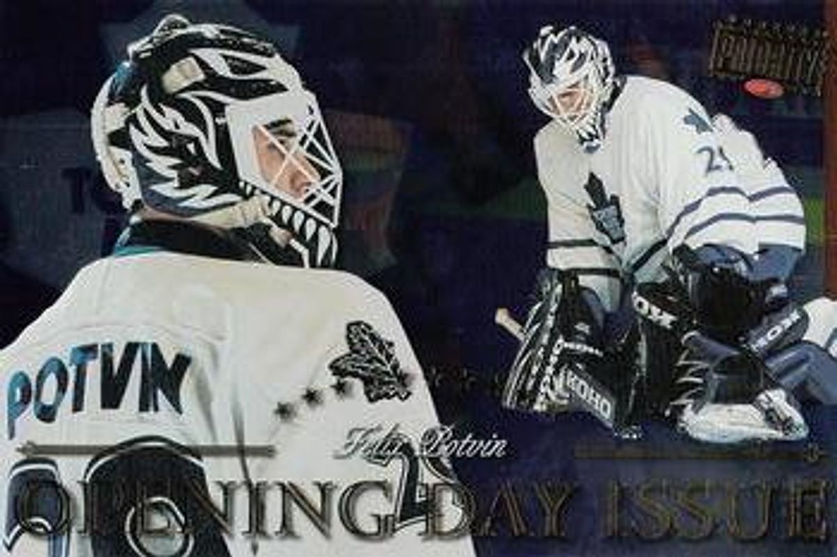 The Felix Potvin 1997 Donruss Priority #25 Postcards Opening Day Issues card is 1 of 12 Felix Potvin's card variations in the 1997 Donruss Priority set being tracked by Sports Card Investor, including #198 Base, #101 Base, #3 Postmaster Generals Promos, #198 Stamp of Approval /100, and #101 Stamp of Approval /100.