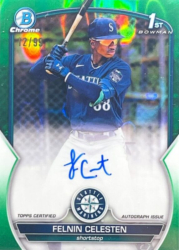 2023 Bowman 1st Chrome Autograph Green Lava Felnin Celesten Mariners /99 Bookend