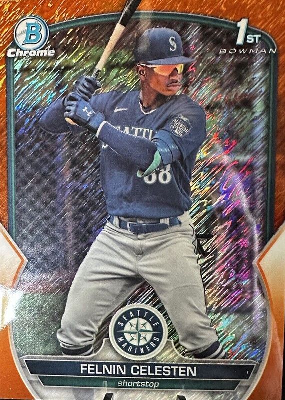 The Felnin Celesten 2023 Bowman Chrome #BCP-156 Prospects - Orange Shimmer Refractor /25 (1st) card in Raw condition has not changed in price in the last 30 days and was last sold for $220.50 .