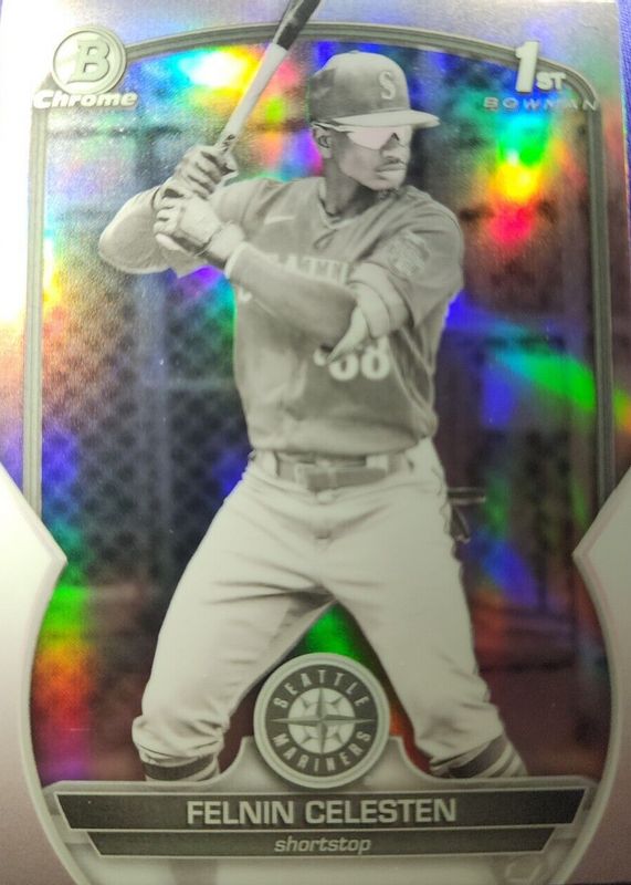 This card is 1 of 44 Felnin Celesten's card variations in the 2023 Bowman Chrome set being tracked by Sports Card Investor, including Prospects (1st), Prospects - Shimmer Refractor (1st), Prospects - Refractor /499 (1st), Prospects - Speckle Refractor /299 (1st), and Prospects - Purple Refractor /250 (1st).