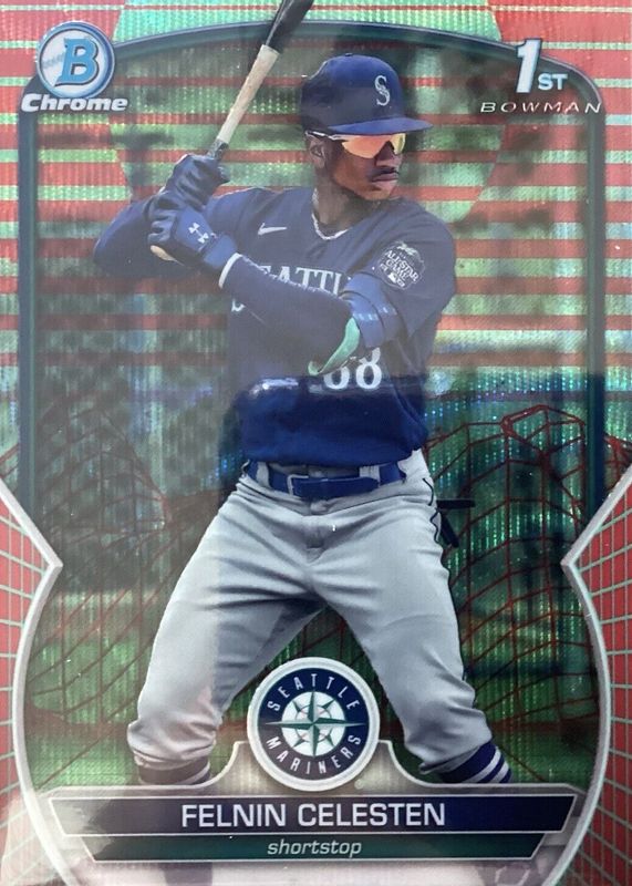 This card is 1 of 44 Felnin Celesten's card variations in the 2023 Bowman Chrome set being tracked by Sports Card Investor, including Prospects (1st), Prospects - Pearl Refractor (1st), Prospects - Shimmer Refractor (1st), Prospects - Refractor /499 (1st), and Prospects - Speckle Refractor /299 (1st).