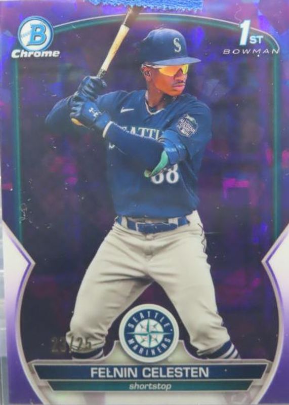 The Felnin Celesten 2023 Bowman Chrome Sapphire Edition #BCP-156 Prospects - Purple /25 (1st) card in Raw condition has not changed in price in the last 30 days and was last sold for $49.99 .