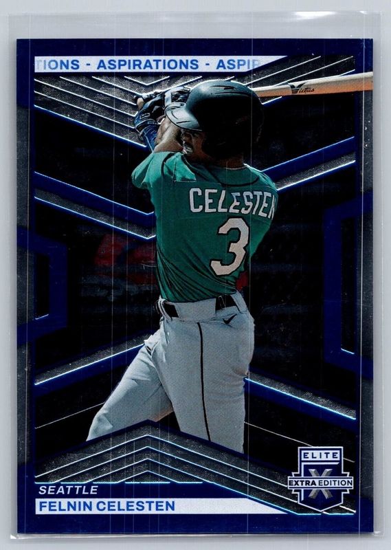 The Felnin Celesten 2023 Elite Extra Edition #113 Aspirations Blue /349 card is 1 of 41 Felnin Celesten's card variations in the 2023 Elite Extra Edition set being tracked by Sports Card Investor, including Base, Pink, Signatures, Status Green /499, and Signatures die-cut /399.