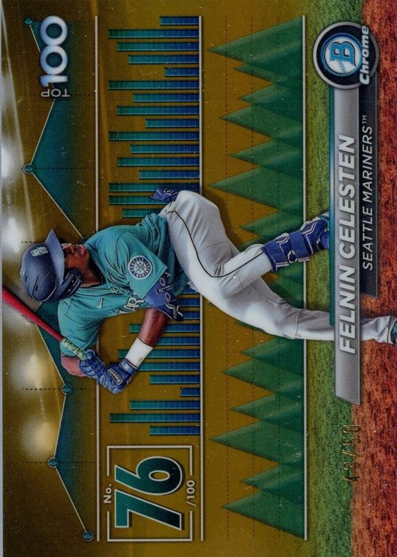 The Felnin Celesten 2024 Bowman #BTP-76 Bowman Scouts' Top 100 - Gold Refractor /50 card in Raw condition has not changed in price in the last 30 days and was last sold for $34.99 .
