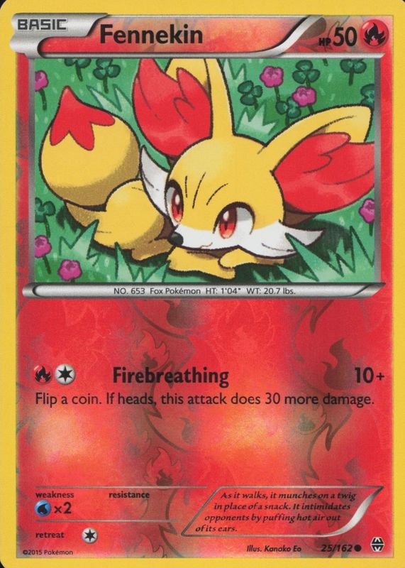 The Fennekin 2015 XY: BREAKthrough #025/162 Reverse Holo card in Raw TCG (Near Mint) condition has moved up $2.54 (+257%) in the last 30 days and was last sold for $3.53 .
