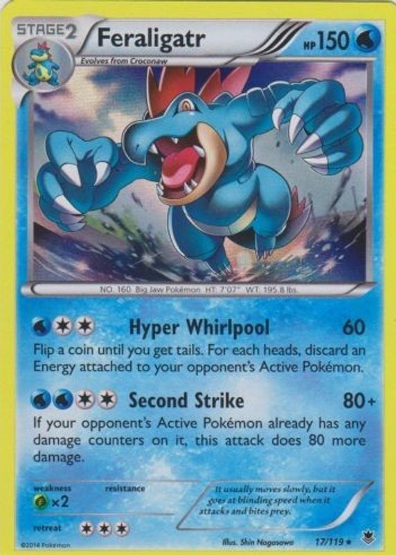 The Feraligatr 2014 XY: Phantom Forces #017/119 Holo card in Raw TCG (Near Mint) condition has moved up $1.17 (+88.6%) in the last 30 days and was last sold for $2.49 .