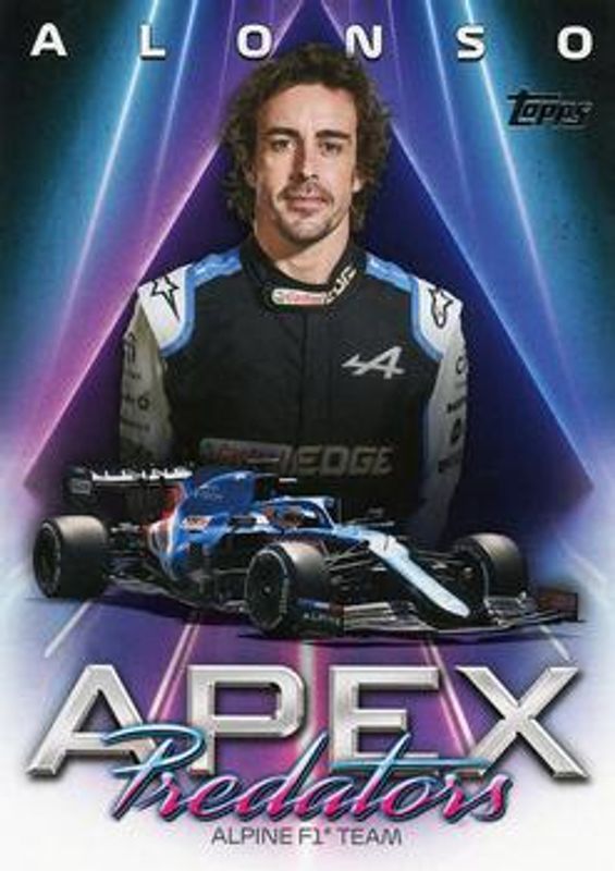 The Fernando Alonso 2021 Topps Formula 1 #AP-FA Apex Predators card is 1 of 82 Fernando Alonso's card variations in the 2021 Topps Formula 1 set being tracked by Sports Card Investor, including #104 Base, #9b Base, #9 Base, #41 Base, and #38 Base.