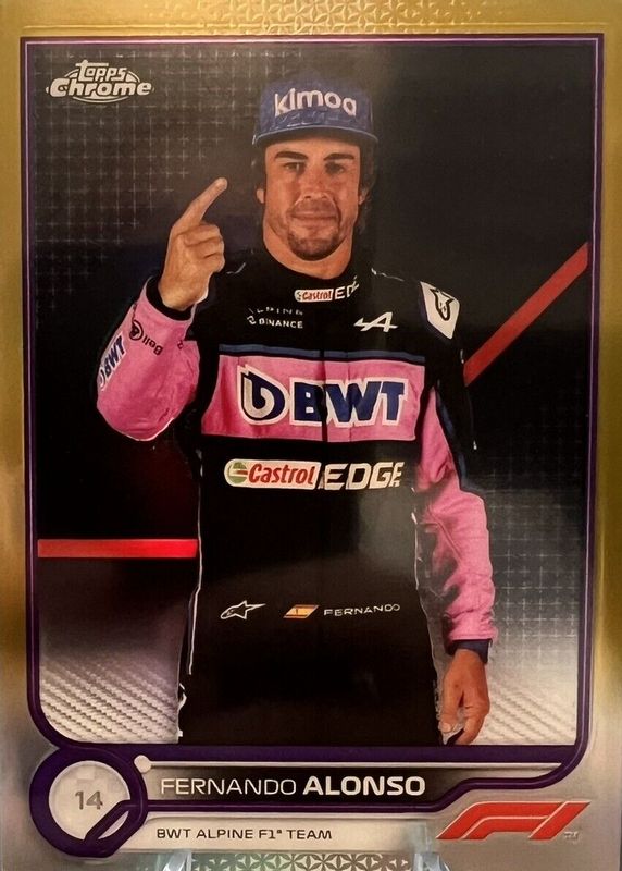 The Fernando Alonso 2022 Topps Chrome Formula 1 #13 Gold & Purple Refractor card in Raw condition has not changed in price in the last 30 days and was last sold for $0.99 .