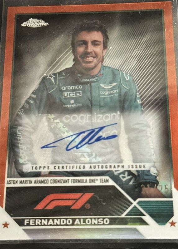 The Fernando Alonso 2023 Topps Chrome Formula 1 #CAC-FA Autographs - Orange Refractor /25 card in Raw condition has not changed in price in the last 30 days and was last sold for $201.76 .