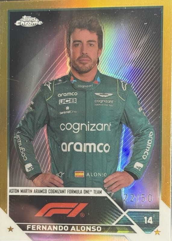 The Fernando Alonso 2023 Topps Chrome Formula 1 #32 Gold Refractor /50 card in Raw condition has not changed in price in the last 30 days and was last sold for $25.00 .