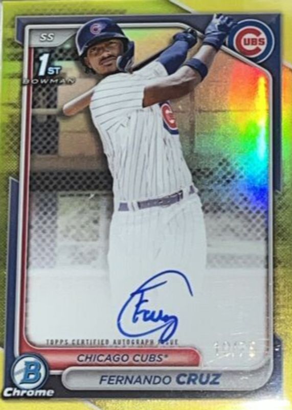 The Fernando Cruz (Cubs) 2024 Bowman Chrome #CPA-FC Prospect Auto - Yellow Refractor /75 (1st) card in Raw condition has not changed in price in the last 30 days and was last sold for $42.89 .