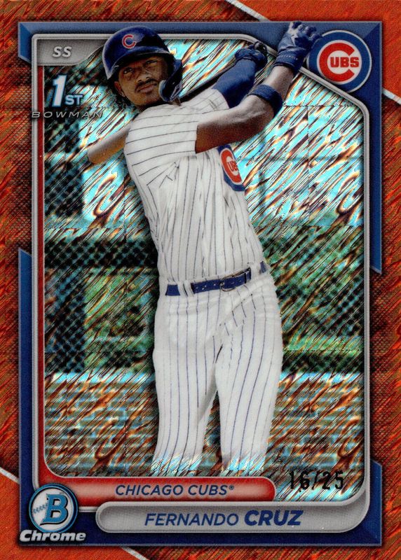 The Fernando Cruz (Cubs) 2024 Bowman Chrome #BCP-197 Prospects - Orange Shimmer Refractor /25 (1st) card in Raw condition has not changed in price in the last 30 days and was last sold for $12.00 .
