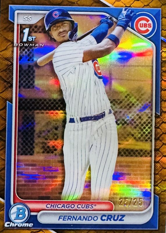 The Fernando Cruz (Cubs) 2024 Bowman Chrome #BCP-197 Prospects - Reptilian Orange Refractor /25 (1st) card in Raw condition has not changed in price in the last 30 days and was last sold for $88.69 .