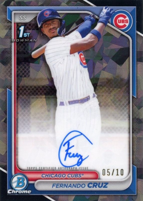The Fernando Cruz (Cubs) 2024 Bowman Chrome Sapphire Edition #CSPA-FC Prospect Auto - Black /10 (1st) card in Raw condition has not changed in price in the last 30 days and was last sold for $137.00 .