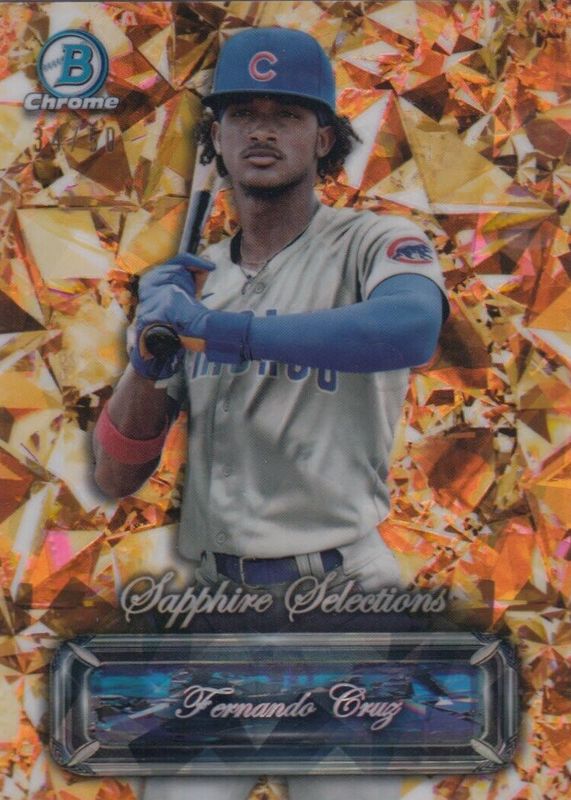 The Fernando Cruz (Cubs) 2024 Bowman Chrome Sapphire Edition #SS-4 Sapphire Selections - Gold /50 card in Raw condition has not changed in price in the last 30 days and was last sold for $13.50 .