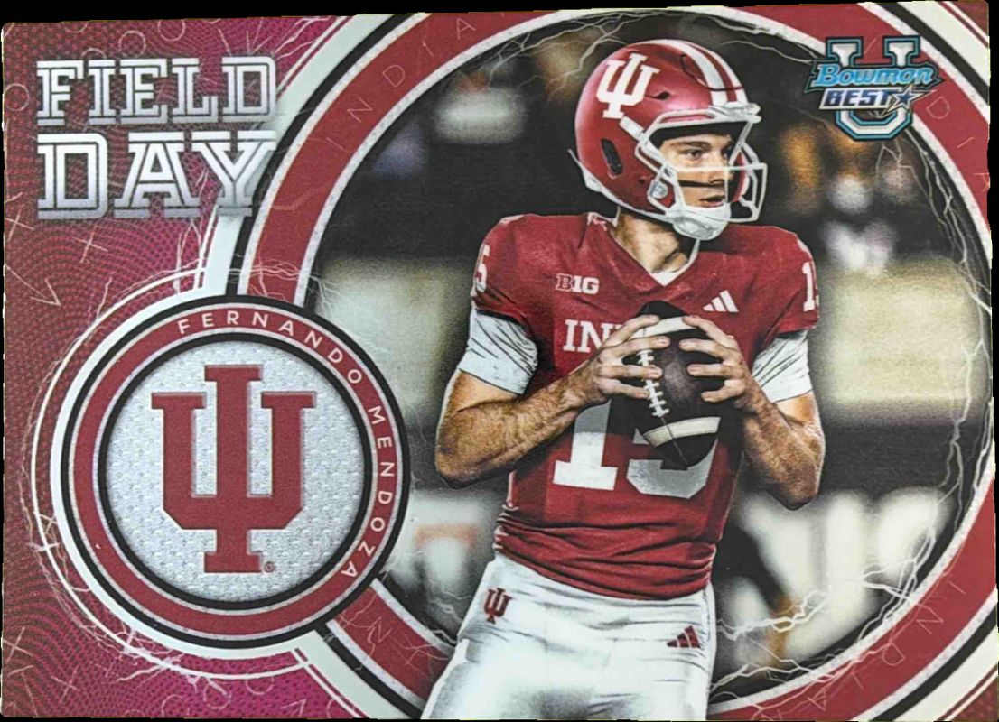 The Fernando Mendoza 2025 Bowman's Best #FD-3 Field Day card is 1 of 49 Fernando Mendoza's card variations in the 2025 Bowman's Best set being tracked by Sports Card Investor, including Base, Refractor, Shimmer Refractor, Yellow Lazer Refractor /250, and Aqua Lava Refractor /199.