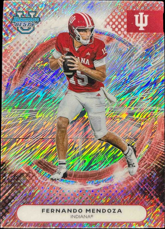 The Fernando Mendoza 2025 Bowman's Best #16 Shimmer Refractor card is 1 of 49 Fernando Mendoza's card variations in the 2025 Bowman's Best set being tracked by Sports Card Investor, including Base, Refractor, Yellow Lazer Refractor /250, Aqua Lava Refractor /199, and Pink Lava Refractor /175.