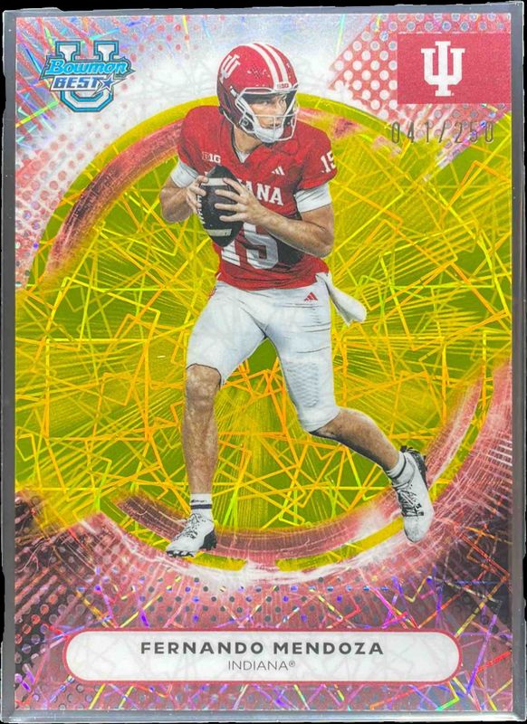 The Fernando Mendoza 2025 Bowman's Best #16 Yellow Lazer Refractor /250 card is 1 of 49 Fernando Mendoza's card variations in the 2025 Bowman's Best set being tracked by Sports Card Investor, including Base, Refractor, Shimmer Refractor, Aqua Lava Refractor /199, and Pink Lava Refractor /175.