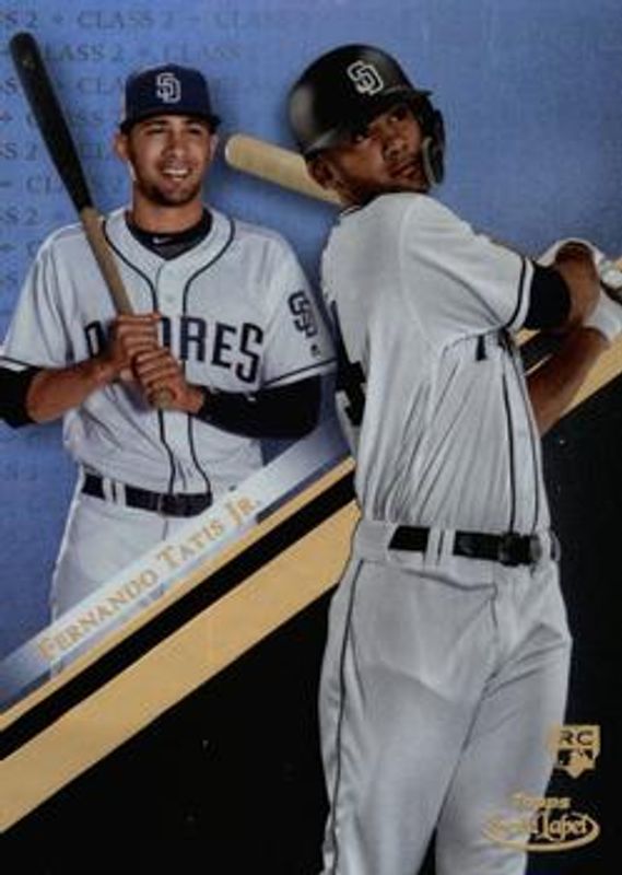 The Fernando Tatis Jr. 2019 Topps Gold Label #100 Class 2 Rookie card is 1 of 25 Fernando Tatis Jr.'s card variations in the 2019 Topps Gold Label set being tracked by Sports Card Investor, including Base, Class 3, Class 1 Black, Class 2 Black, and Class 3 Black.