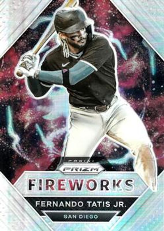 The Fernando Tatis Jr. 2021 Prizm #FW2 Fireworks - Silver card is 1 of 90 Fernando Tatis Jr.'s card variations in the 2021 Prizm set being tracked by Sports Card Investor, including Base, Blue, Blue Velocity, Carolina Blue, and Cosmic Haze.
