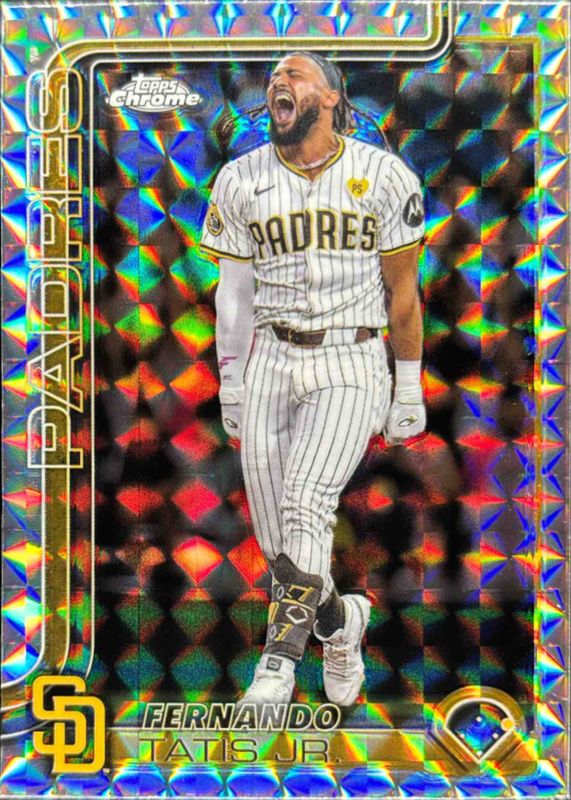 The Fernando Tatis Jr. 2025 Topps Chrome #159 Geometric Refractor card is 1 of 94 Fernando Tatis Jr.'s card variations in the 2025 Topps Chrome set being tracked by Sports Card Investor, including Base, Image Variation, Lightboard Logo Variation, Negative Refractor, and Prism Refractor.