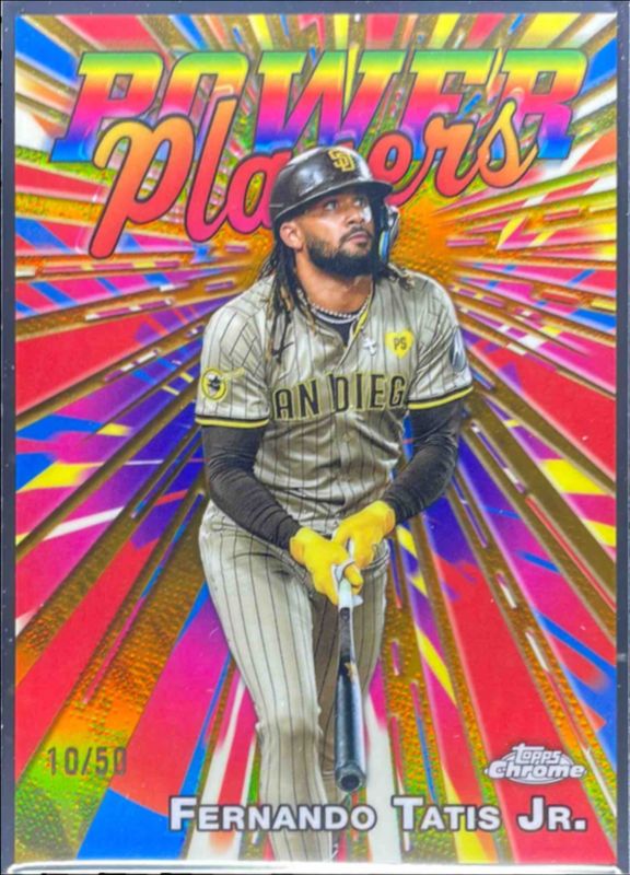 The Fernando Tatis Jr. 2025 Topps Chrome #PP-17 Power Players - Gold Refractor /50 card is 1 of 94 Fernando Tatis Jr.'s card variations in the 2025 Topps Chrome set being tracked by Sports Card Investor, including Base, Geometric Refractor, Image Variation, Lightboard Logo Variation, and Negative Refractor.