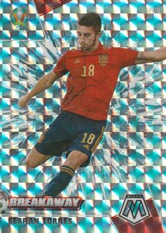 The Ferran Torres 2021 Mosaic Euro #30 Breakaway card is 1 of 8 Ferran Torres' card variations in the 2021 Mosaic Euro set being tracked by Sports Card Investor, including Breakaway - Green, Breakaway - Purple Fluorescent /70, Stained Glass /(SSP), Breakaway - Orange Fluorescent /25, and Breakaway - Blue Fluorescent /15.