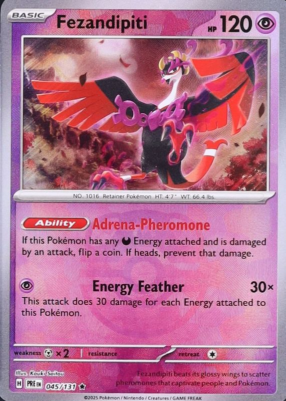 The Fezandipiti 2025 Scarlet & Violet: Prismatic Evolutions #045/131 Master Ball Reverse Holo card in Raw TCG (Lightly Played) condition has not changed in price in the last 30 days and was last sold for $5.08 .
