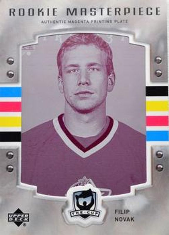 The Filip Novak 2006 Upper Deck The Cup #M-109 Printing Plates Upper Deck Trilogy Magenta /1 Rookie card is 1 of 36 Filip Novak's card variations in the 2006 Upper Deck The Cup set being tracked by Sports Card Investor, including Base /249, Printing Plates Cyan /1, Printing Plates Magenta /1, Printing Plates Yellow /1, and Printing Plates O-Pee-Chee - Black.