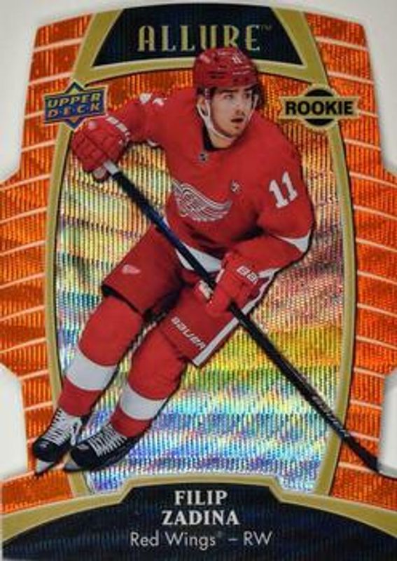 The Filip Zadina 2019 Upper Deck Allure #81 Orange Slice /199 Rookie card is 1 of 42 Filip Zadina's card variations in the 2019 Upper Deck Allure set being tracked by Sports Card Investor, including #103 Base, #81 Base, #81 Pewter, #103 Pink Diamond, and #81 Red Rainbow.