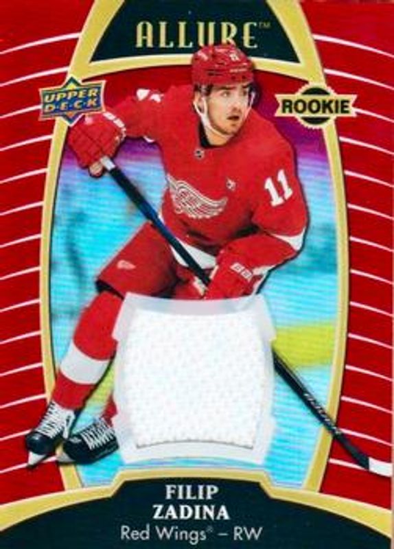 The Filip Zadina 2019 Upper Deck Allure #81 Red Rainbow Jersey Relics Rookie card is 1 of 42 Filip Zadina's card variations in the 2019 Upper Deck Allure set being tracked by Sports Card Investor, including #103 Base, #81 Base, #81 Pewter, #103 Pink Diamond, and #81 Red Rainbow.