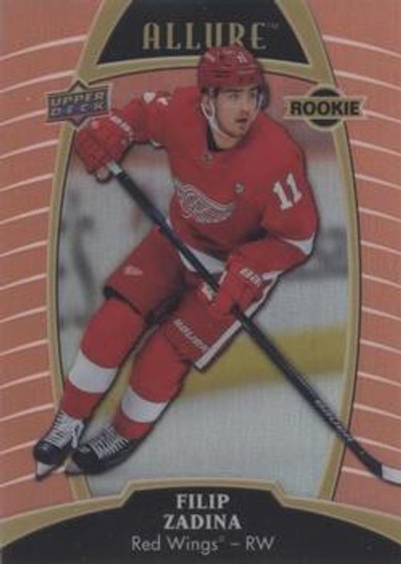 The Filip Zadina 2019 Upper Deck Allure #81 Sunset Rookie card is 1 of 42 Filip Zadina's card variations in the 2019 Upper Deck Allure set being tracked by Sports Card Investor, including #103 Base, #81 Base, #81 Pewter, #103 Pink Diamond, and #81 Red Rainbow.
