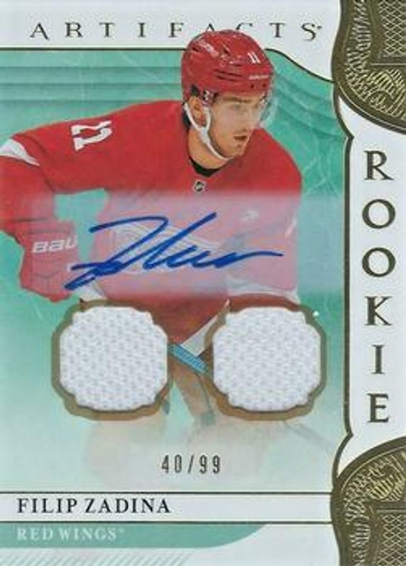 The Filip Zadina 2019 Upper Deck Artifacts #165 Auto Materials - Gold /15 Rookie card is 1 of 23 Filip Zadina's card variations in the 2019 Upper Deck Artifacts set being tracked by Sports Card Investor, including Base /999, Ruby /399, Copper /299, Emerald /99, and Aqua /45.