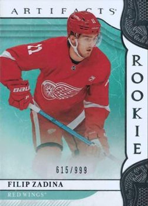 The Filip Zadina 2019 Upper Deck Artifacts #165 Base /999 Rookie card is 1 of 23 Filip Zadina's card variations in the 2019 Upper Deck Artifacts set being tracked by Sports Card Investor, including Ruby /399, Copper /299, Emerald /99, Aqua /45, and Purple /20.