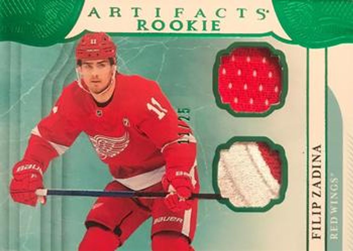 The Filip Zadina 2019 Upper Deck Artifacts #165 Horizontal Materials - Emerald /5 Rookie card is 1 of 23 Filip Zadina's card variations in the 2019 Upper Deck Artifacts set being tracked by Sports Card Investor, including Base /999, Ruby /399, Copper /299, Emerald /99, and Aqua /45.