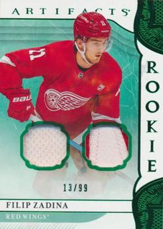 The Filip Zadina 2019 Upper Deck Artifacts #165 Materials - Emerald /25 Rookie card is 1 of 23 Filip Zadina's card variations in the 2019 Upper Deck Artifacts set being tracked by Sports Card Investor, including Base /999, Ruby /399, Copper /299, Emerald /99, and Aqua /45.