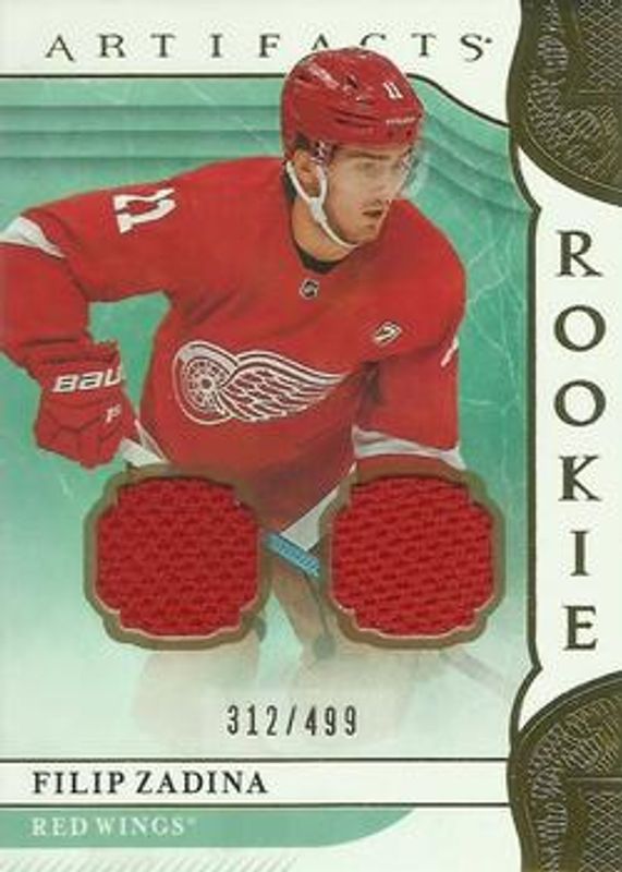 The Filip Zadina 2019 Upper Deck Artifacts #165 Materials - Gold /125 Rookie card is 1 of 23 Filip Zadina's card variations in the 2019 Upper Deck Artifacts set being tracked by Sports Card Investor, including Base /999, Ruby /399, Copper /299, Emerald /99, and Aqua /45.