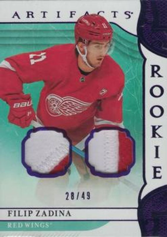 The Filip Zadina 2019 Upper Deck Artifacts #165 Materials - Purple /8 Rookie card is 1 of 23 Filip Zadina's card variations in the 2019 Upper Deck Artifacts set being tracked by Sports Card Investor, including Base /999, Ruby /399, Copper /299, Emerald /99, and Aqua /45.