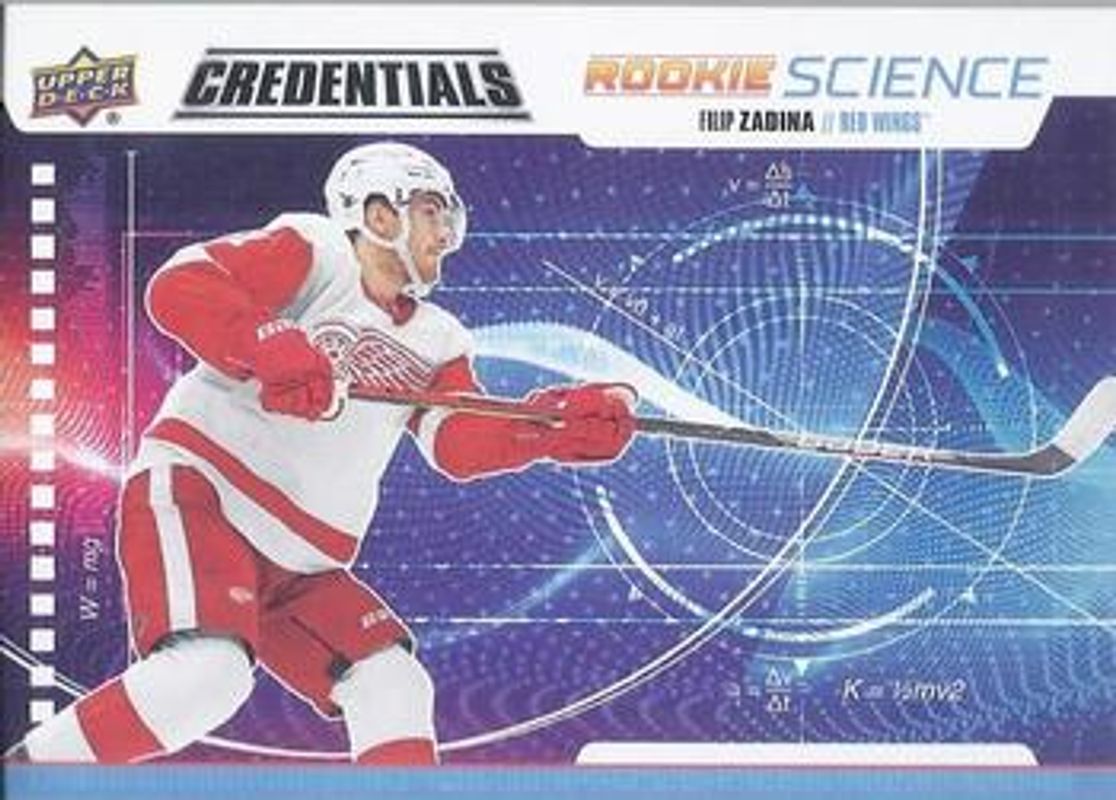 The Filip Zadina 2019 Upper Deck Credentials #RS-05 Rookie Science card is 1 of 22 Filip Zadina's card variations in the 2019 Upper Deck Credentials set being tracked by Sports Card Investor, including Base /699, Red /99, Green /25, Purple /10, and Black /1.