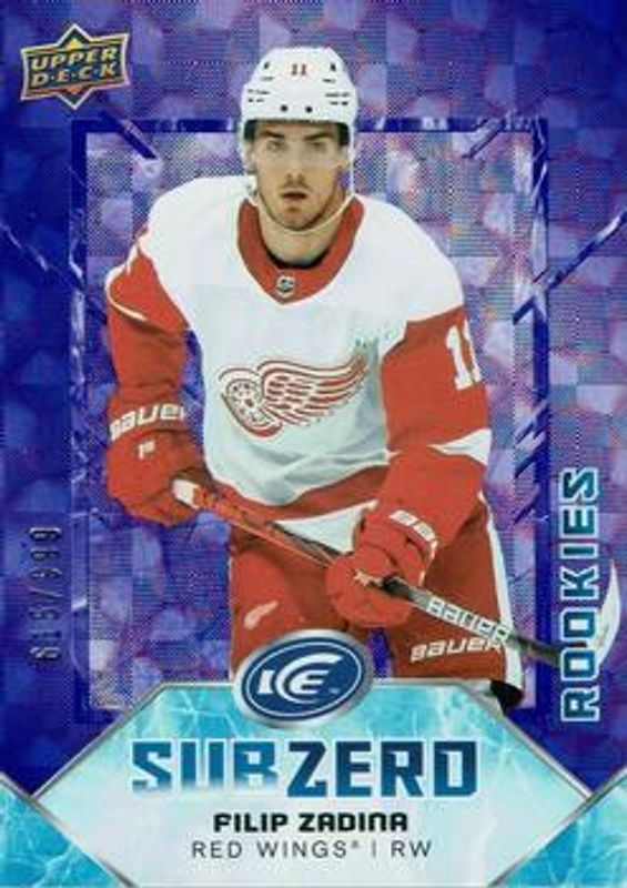 The Filip Zadina 2019 Upper Deck Ice #SZ-26 Sub Zero Rookies /999 card is 1 of 18 Filip Zadina's card variations in the 2019 Upper Deck Ice set being tracked by Sports Card Investor, including Base /499, Black /1, Ice Premieres die-cut, Ice Premieres - Jersey Relics, and Exquisite Collection Platinum Rookies /399.