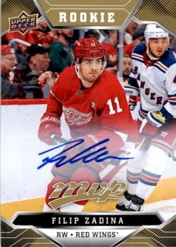 The Filip Zadina 2019 Upper Deck MVP #223 Autographs Rookie card is 1 of 18 Filip Zadina's card variations in the 2019 Upper Deck MVP set being tracked by Sports Card Investor, including Base, Blue, Gold Script, Silver Script, and Super Script /25.