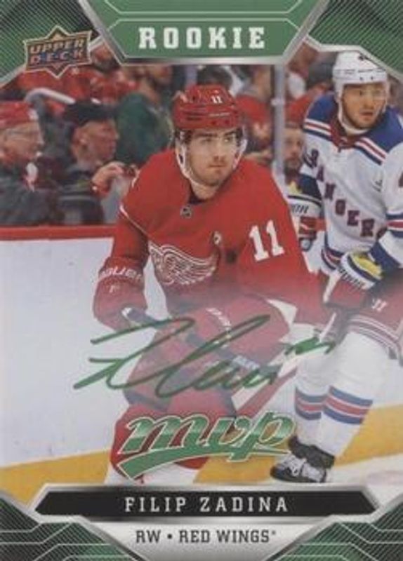 The Filip Zadina 2019 Upper Deck MVP #223 Green Script Rookie card is 1 of 18 Filip Zadina's card variations in the 2019 Upper Deck MVP set being tracked by Sports Card Investor, including Base, Blue, Gold Script, Silver Script, and Super Script /25.